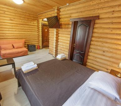 Гостевой комплекс имеет собственную территорию с хорошо продуманной планировкой. Она огорожена, тщательно охраняется и благоустроена зелеными насаждениями, цветниками и газонами. Жилой фонд комплекса представлен шестью 2-этажными бревенчатыми домиками с внутренней отделкой и мебелью из ценных древесных пород. Номера гостиницы, способные одновременно вместить не менее 100 человек, имеют категорию «стандарт» и предназначены для проживания двух человек – с возможностью устройства дополнительного места. Каждый номер меблирован в современном вкусе и обеспечен автономным санузлом с душем, феном и туалетными принадлежностями. Во всех номерах есть система кондиционирования воздуха, холодильник, сейф, телевизор и Wi-Fi.